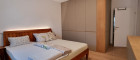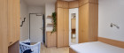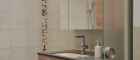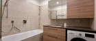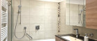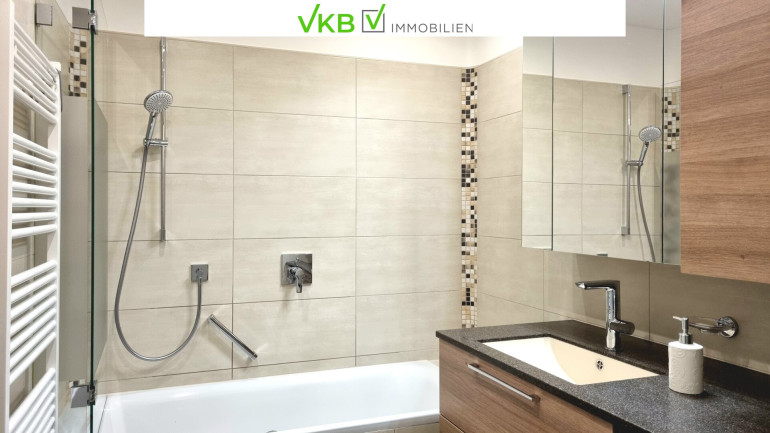 Modern ausgestattetes Badezimmer mit komfortabler Badewanne. Eine Glasschiebetür trennt den WC-Bereich stilvoll vom restlichen Bad und sorgt für Privatsphäre bei gleichzeitig offener Raumwirkung.