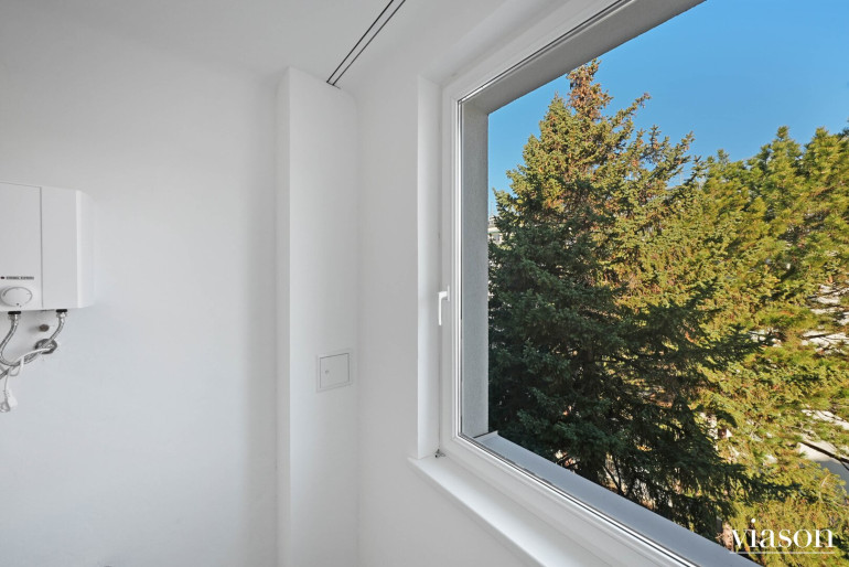 Das Badezimmer ist komfortabel ausgestattet mit Badewanne, Bidet, WC, Doppelwaschbecken inklusive Spiegelschrank und verfügt über zwei Fenster, die für natürliche Belichtung und Belüftung sorgen. Im Haus stehen den Bewohnern eine Waschküche und ein Trockenraum zur Verfügung. Die Fahrradabstellplätze befinden sich im Innenhof im Freien. Zusätzlich kann ein Einlagerungsraum im Keller des Hauses mit ca. 5,60 m² genutzt werden.