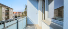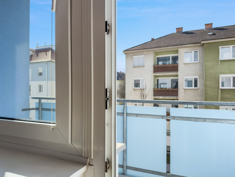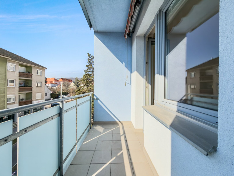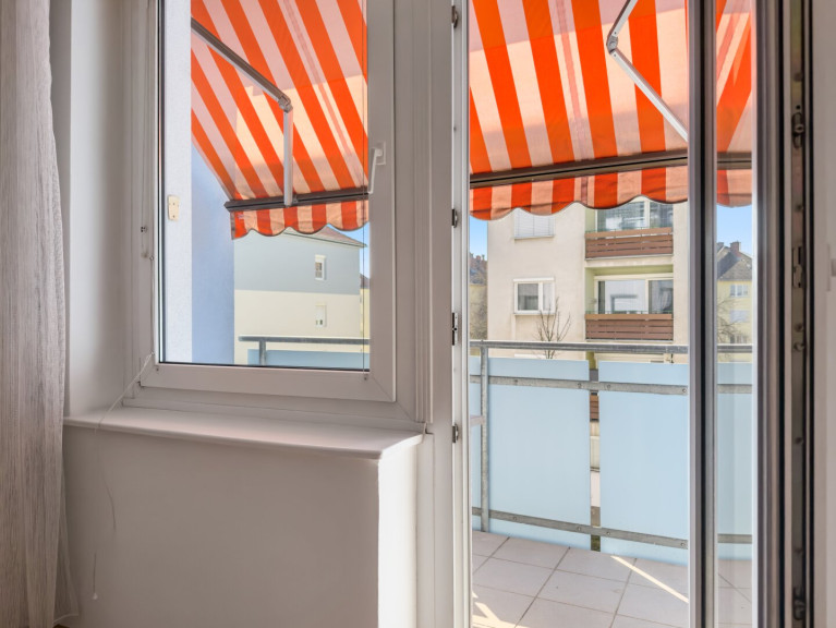 Die südöstlich ausgerichtete Loggia mit Markise erweitert den Wohnraum nach außen. Morgensonne, geschützter Sitzplatz, Blick ins Umfeld – ein kleines Stück Freiraum mitten in der Stadt.