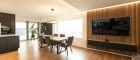 Das Herzstück des Hauses ist der rund 45m² große Wohn- und Essbereich mit direktem Zugang in den geschützten Außenbereich. Große Fensterflächen öffnen den Raum nach außen und schaffen fließende Übergänge zwischen Innen- und Außenraum. Besonders eindrucksvoll präsentiert sich der Poolbereich als architektonisch geschützter Rückzugsraum. Die Gebäudestruktur rahmt die Terrasse und den ca. 6 x 3 m großen Pool bewusst ein und erzeugt eine private Atmosphäre mit hoher Aufenthaltsqualität. Im Frühling, Sommer und Herbst lässt sich das schöne Wetter hier in besonderer Form genießen. Morgens ein paar Längen im Wasser, nachmittags entspannen auf der Terrasse, abends mit Freunden den Tag ausklingen lassen, dieser Bereich wird schnell zum Lebensmittelpunkt in der warmen Jahreszeit.