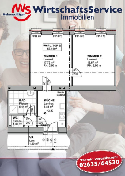 Auf einer Fläche von 53,14 m² befindet sich eine Küche, Ess-/Wohnzimmer, Badezimmer, WC und ein Schlafzimmer.