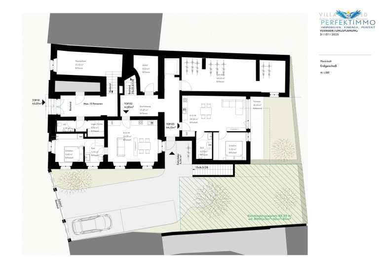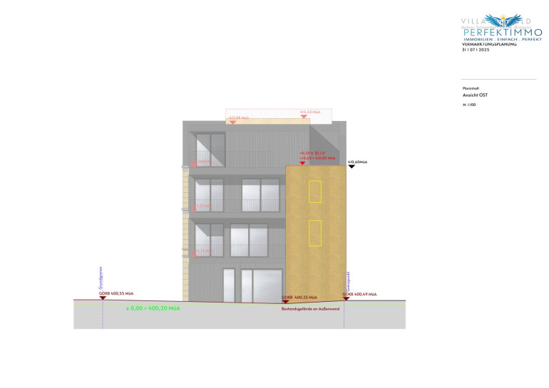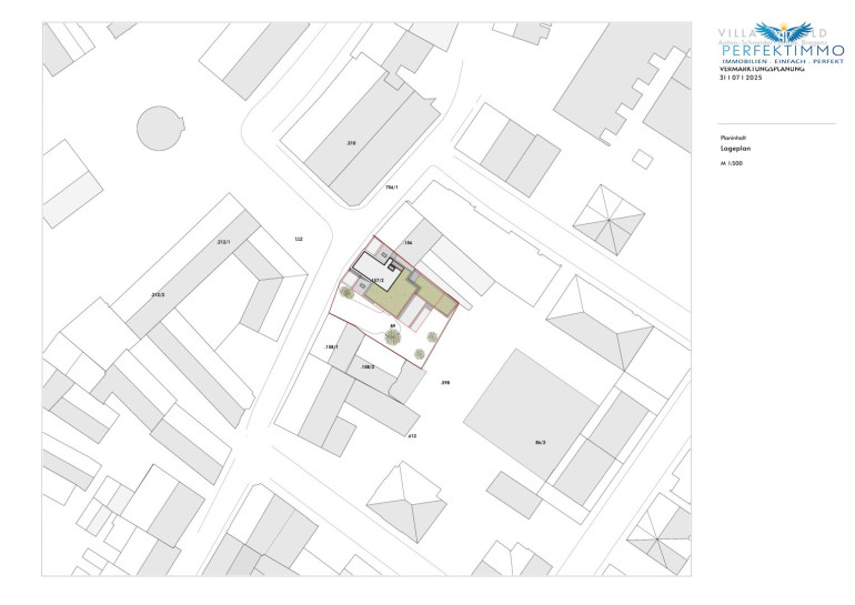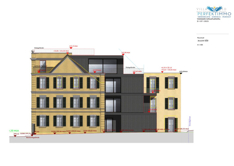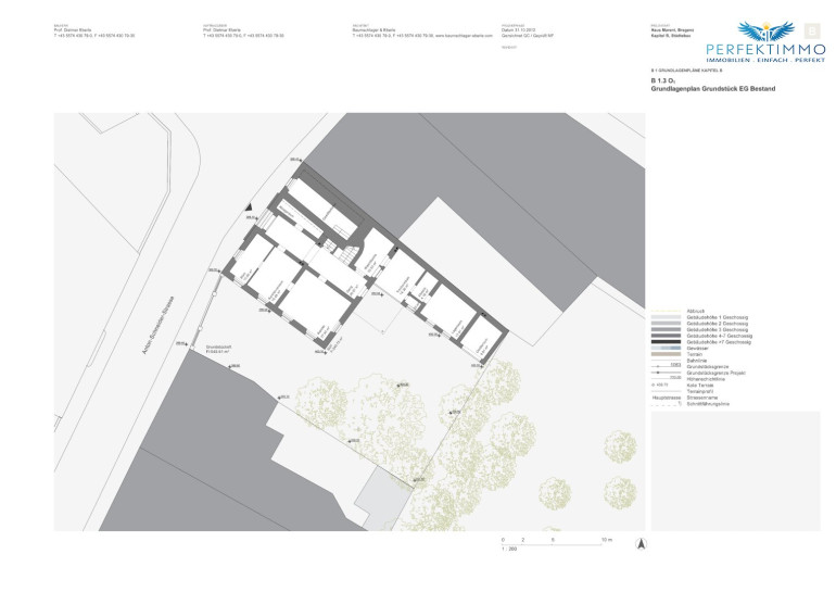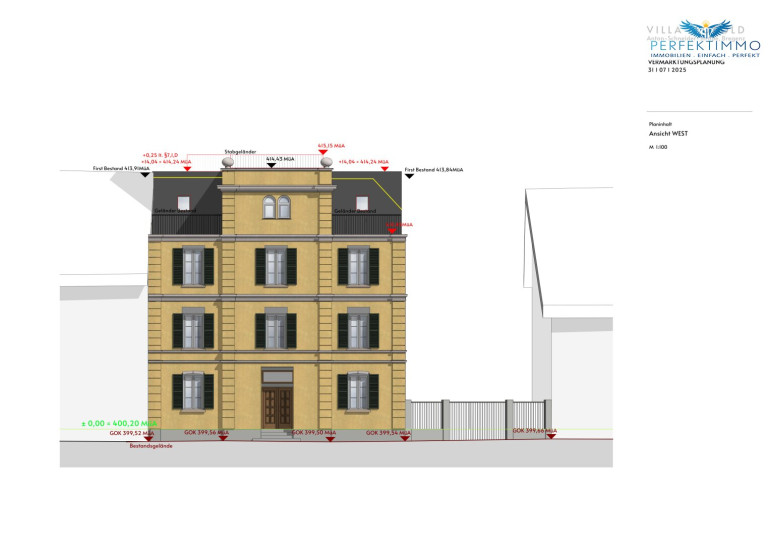 Potenzial liegt in der bereits mit der Stadt besprochenen Planung für den Um- und Ausbau der Liegenschaft. Mit dieser Planung kann die Nutzfläche von 593 m² reine Wohnfläche erweitert werden, und zusätzlich gibt es über 167 m² Terrassen, sowie Gartenflächen im EG und DG die genutzt werden können. Die Liegenschaft wird bestandsfrei und samt entsprechender Baugenehmigung veräußert.