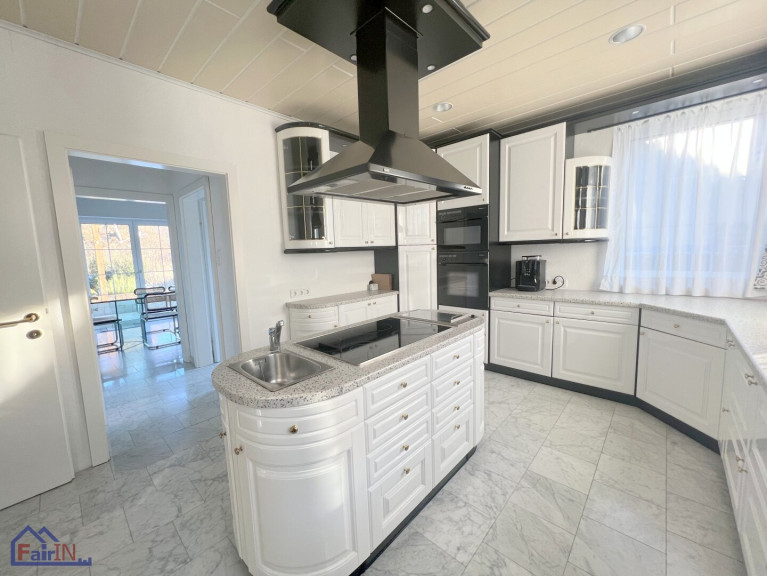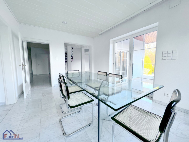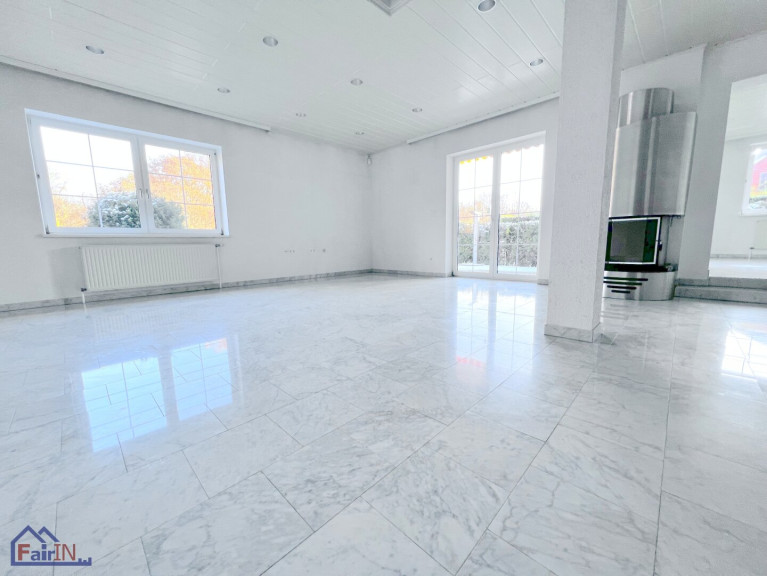 Das Erdgeschoss unterteilt sich in einen Flur, riesiges, fast 50m² großes Wohnzimmer mit einem traumhaften Kamin, Esszimmer, gehoben eingerichtete riesengroße Küche, Bad, WC, ein Schlafzimmer, sowie ein Arbeitsraum. Die südlich gerichtete Terrasse (ca. 40 m² groß) ist sowohl vom Wohnzimmer als auch vom Esszimmer begehbar und besticht durch den traumhaften Gartenblick. Alle Räumlichkeiten sind mit hochwertigen Marmorfliesen ausgestattet.