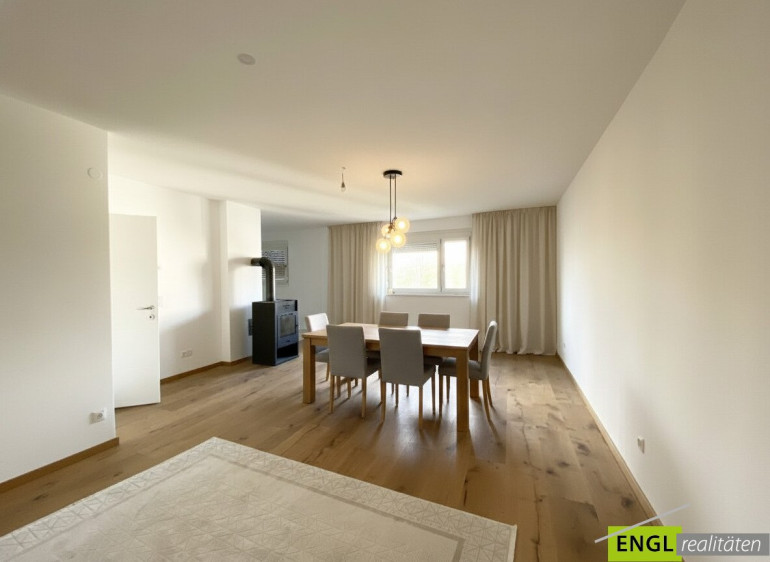 Die Wohnküche - der Küchenteil verfliest - der Wohnbereich mit Parkett ausgestattet - inkl. Schwedenofen.