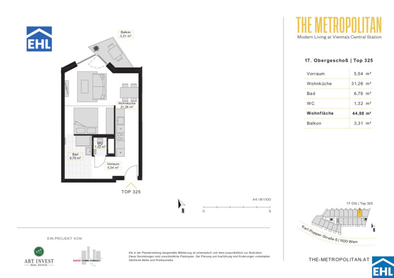 Das moderne Wohnbauprojekt „METROPOLITAN – Modern Living“ befindet sich im aufstrebenden und lebendigen Sonnwendviertel, nur wenige Gehminuten vom neu errichteten Hauptbahnhof entfernt. Die Lage bietet eine hervorragende Infrastruktur mit zahlreichen Einkaufsmöglichkeiten, Restaurants und Cafés in der Umgebung. Besonders hervorzuheben ist die Nähe zum Helmut-Zilk-Park, der Erholung und Freizeitspaß für die ganze Familie bietet.