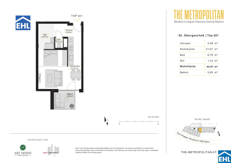 Das moderne Wohnbauprojekt „METROPOLITAN – Modern Living“ befindet sich im aufstrebenden und lebendigen Sonnwendviertel, nur wenige Gehminuten vom neu errichteten Hauptbahnhof entfernt. Die Lage bietet eine hervorragende Infrastruktur mit zahlreichen Einkaufsmöglichkeiten, Restaurants und Cafés in der Umgebung. Besonders hervorzuheben ist die Nähe zum Helmut-Zilk-Park, der Erholung und Freizeitspaß für die ganze Familie bietet.