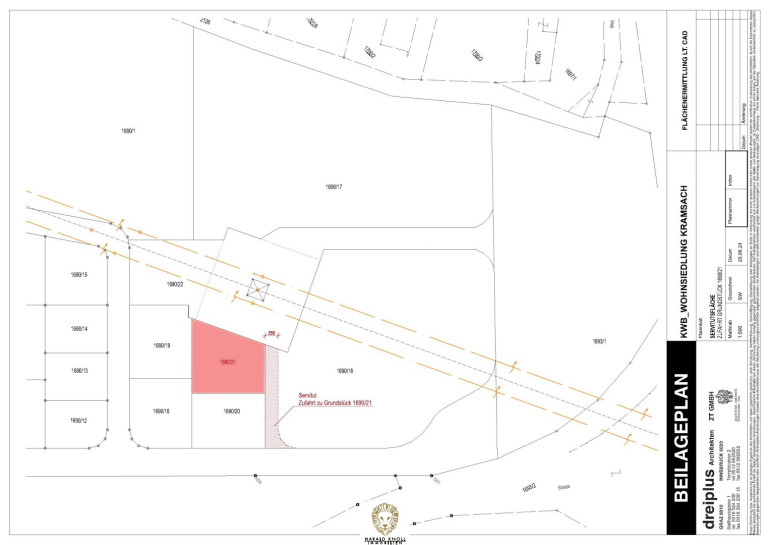 Die Zufahrt erfolgt über einen Dienstbarkeitsweg auf der Ostseite, dort sind auch die Leitungen für die Ver- und Entsorgung vorgesehen.