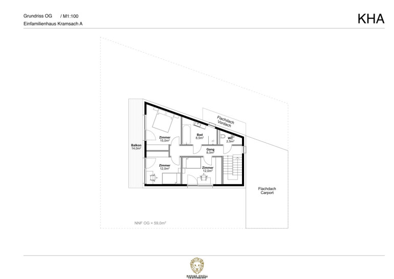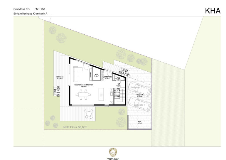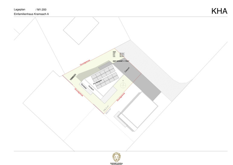 Durch die Öffnung des Baukörpers in westlicher Richtung ergeben sich tolle architektonische und grundrissliche Möglichkeiten: im Erdgeschoß helles offenes Kochen, Essen und Wohnen nach Westen orientiert, im Obergeschoß finden ein Elternzimmer, 2 Kinderzimmer sowie ein Familienbad ihren Platz.