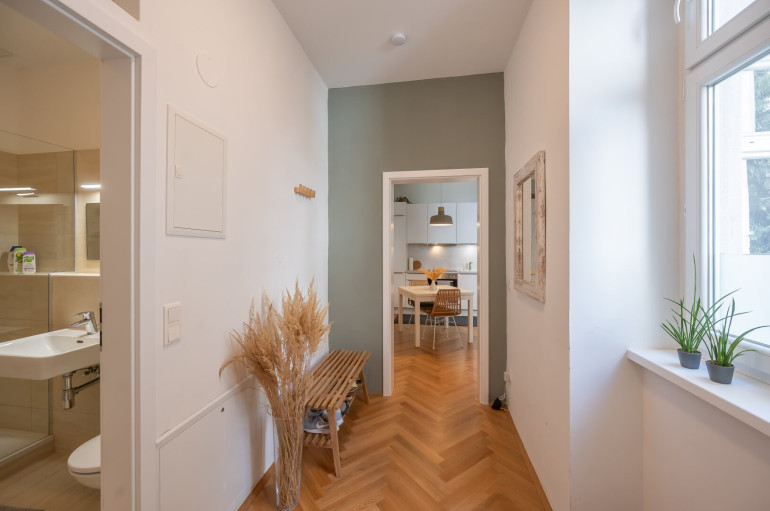 Die Wohnung ist hochwertig ausgestattet. In allen Zimmern ist ein wunderschöner Parkettboden verlegt, die Nassräume werden hochwertig verfliest und mit Markenarmaturen ausgestattet.