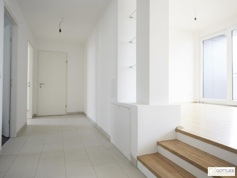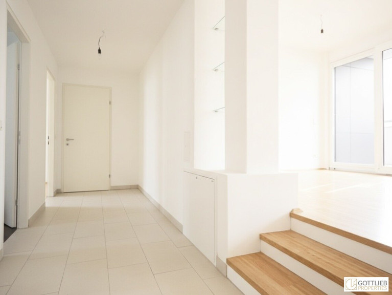 Vom zentralen Eingangsbereich erreicht man den grosszügigen Wohn-Ess-Bereich mit Split-Level-Charakter. Die offene Wohnküche ist mit einer modernen Maß-Einbauküche ausgestattet. Über drei Stufen erreicht man den beeindruckenden Wohnsalon mit Panoramaverglasung und vorgelagerter Terrasse. Das Dachgeschoss verfügt über zwei Schlafzimmer, ein Tageslicht-Wannenbad, eine separate Toilette und einen Schrankraum.