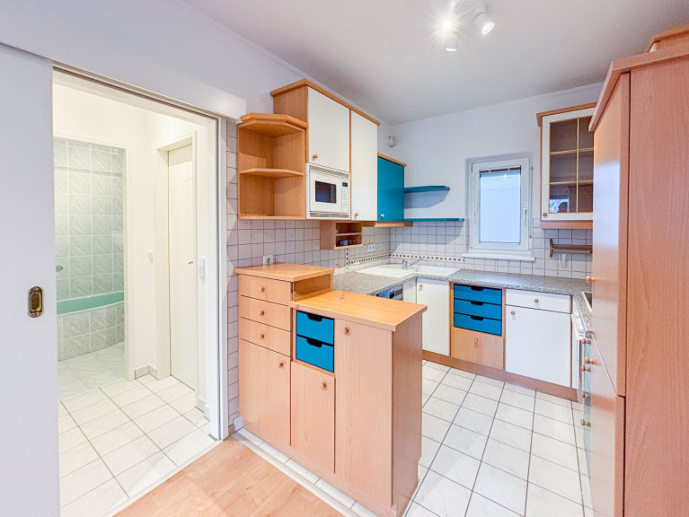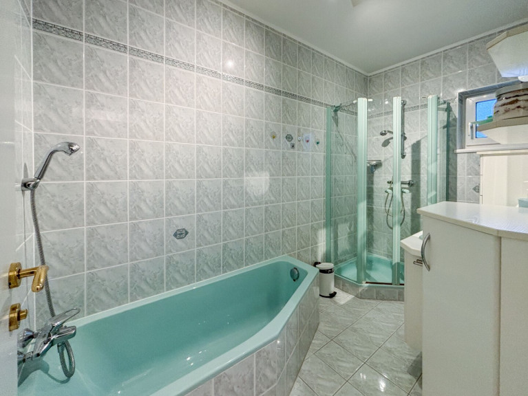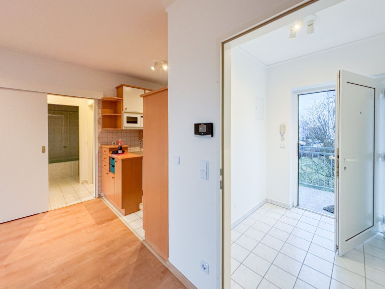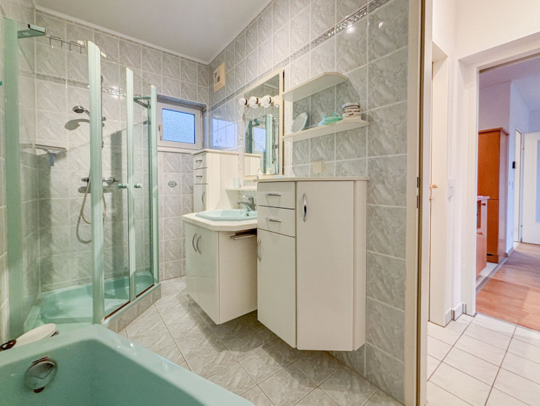 Fliesen, Parkett, Fußbodenheizung, Einbauküche, Bad mit Fenster, Badewanne, Dusche, Parkplatz