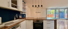 Großzügige Wohnküche mit Kochinsel und direktem Gartenzugang
