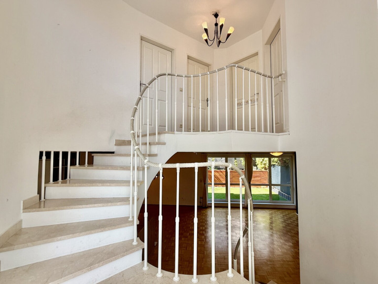 Eine elegante Wendeltreppe verbindet das Erdgeschoss mit dem Obergeschoss, wo sich zwei zentral begehbare Zimmer sowie ein zusätzliches Kabinett befinden – ideal als Schlafzimmer, Kinderzimmer oder Homeoffice. Ein modernes Badezimmer mit WC und ein weiterer Abstellraum innerhalb eines der Zimmer sorgen für zusätzlichen Komfort und Stauraum.