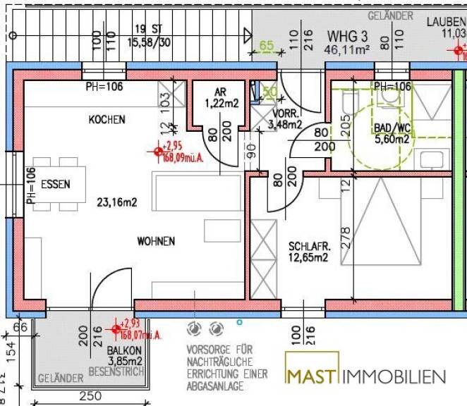 Die Wohnung verfügt über rund 46,11 m2 reine Wohnfläche + einen 3,85 m2 Balkon.