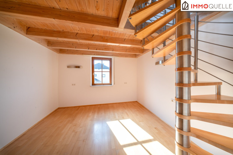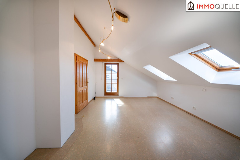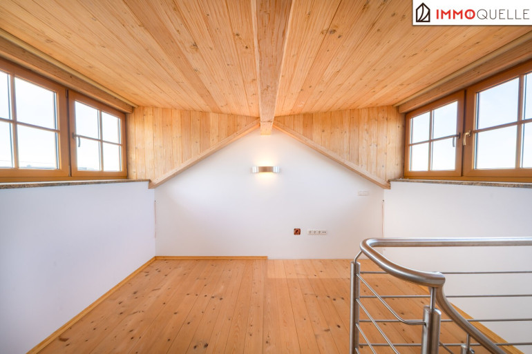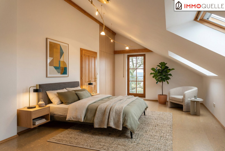 Im Obergeschoss erwarten Sie drei Schlafzimmer - zwei davon mit eigenem Balkon. Morgens die Tür öffnen, frische Luft einatmen und den Blick über die Berge schweifen lassen. Ein großzügiges Badezimmer, ein separates WC sowie ein Abstellraum sorgen für Komfort im Familienalltag. Ein besonderes Highlight ist das Schlafzimmer mit Aufgang in den charmanten Mansardenraum: Ein Ort für Rückzug und Kreativität. Von der Gaupe aus genießen Sie einen wunderbaren Ausblick - ein Rückzugsort für stille Momente und kreative Stunden. Zusätzlich besteht die Möglichkeit, das Garagendach auszubauen und ca. 35–40 m² weitere Wohnfläche zu schaffen.