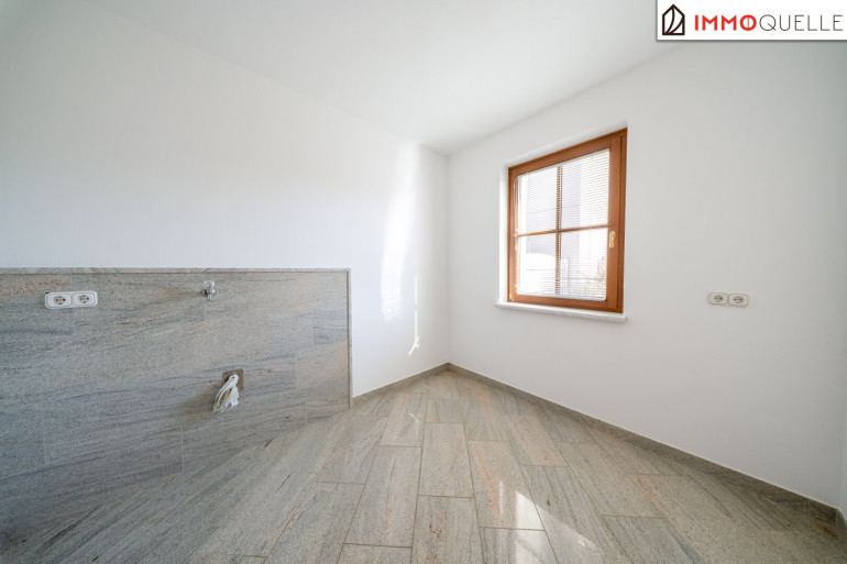 Von hier aus öffnet sich der klar strukturierte Wohnbereich und führt direkt in das lichtdurchflutete Esszimmer - offen, einladend und Mittelpunkt des familiären Lebens. Links schließt die Tischlerküche mit Speis an, hell und funktional gestaltet, mit viel Arbeitsfläche und kurzen Wegen. Rechts ergänzt das Wohnzimmer mit Balkon und Kachelofen das Ensemble - ein Ort für entspannte Stunden mit Blick ins Grüne.