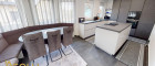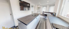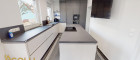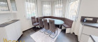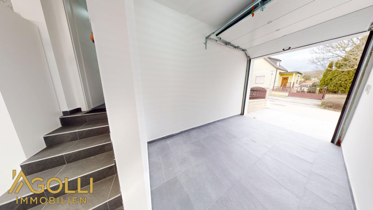 Über den liebevoll angelegten Vorgarten gelangt man in das Haus, wo ein vollständig verfliester Vorraum mit Garderobe, Schuhschrank und Spiegel empfängt. Von hier aus führt der Weg in das helle Wohnzimmer mit gemütlichem Kamin und moderner Einrichtung. Ein kleines Eckbüro verbindet den Wohnbereich mit der Terrasse und dem Garten. Direkt angrenzend befindet sich die getrennte, großzügige Küche mit Essbereich für bis zu neun Personen. Die Küche ist voll ausgestattet und verfügt über hochwertige Siemens-Einbaugeräte, eine moderne Kochinsel sowie einen integrierten Fernseher. Zusätzlich befinden sich im Erdgeschoss ein modernes Badezimmer mit Walk-In-Dusche und Fenster, ein separates Gäste-WC sowie das Master Bedroom mit Doppelbett und großzügigen Schrankflächen. Besonders praktisch: die direkt ans Haus angeschlossene Garage, wodurch man jederzeit trockenen Fußes ins Haus gelangt. Hinter der Garage befindet sich ein Vorratsraum mit zusätzlichem Gartenzugang.