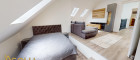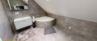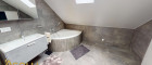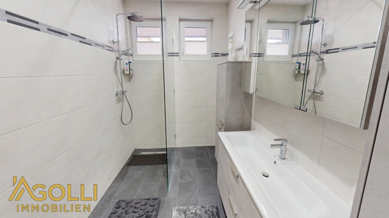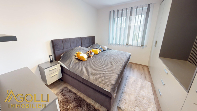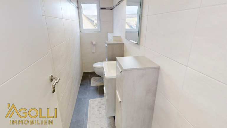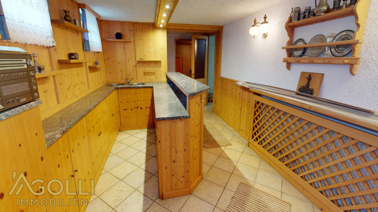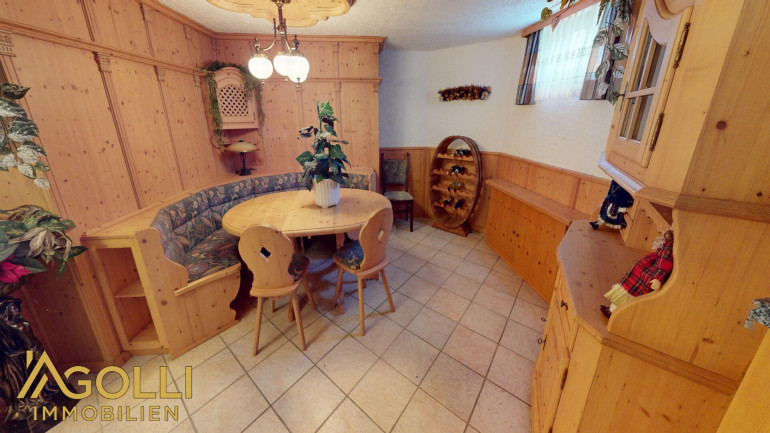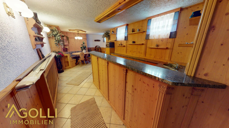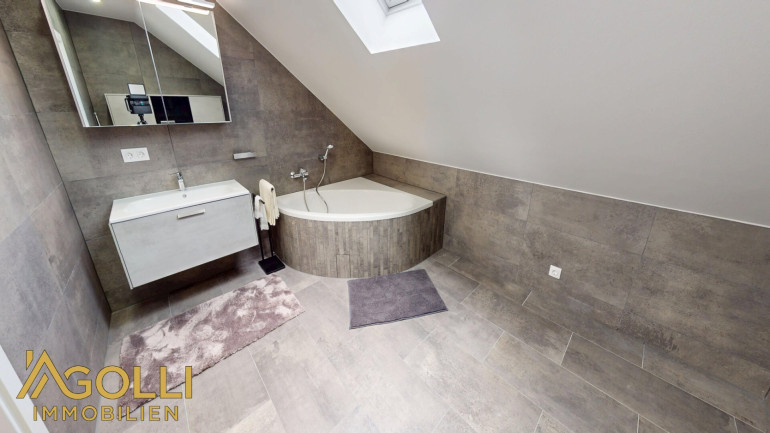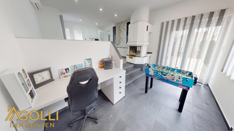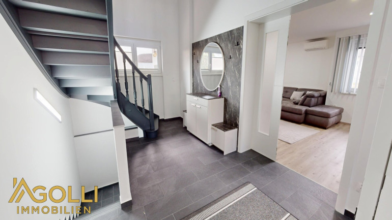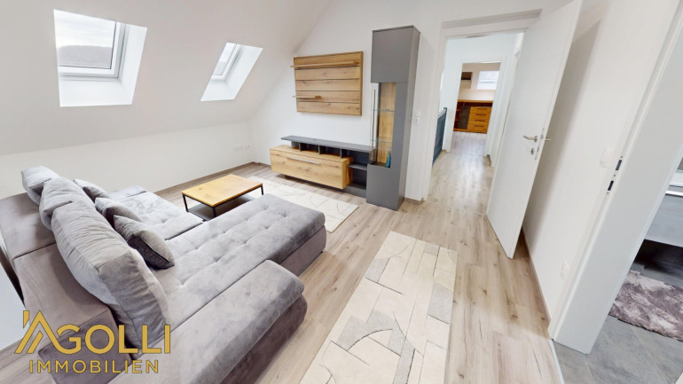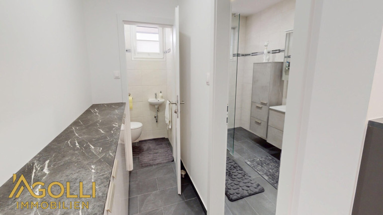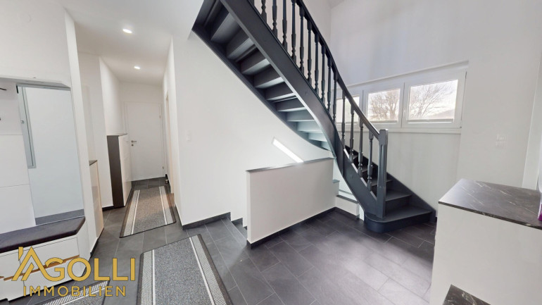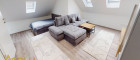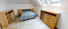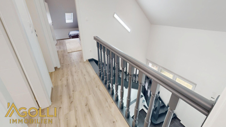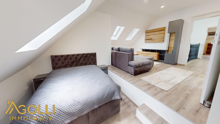 Über eine stilvoll restaurierte Holz-Massivtreppe erreicht man das Obergeschoss. Hier befindet sich ein separates WC mit Fenster sowie ein vielseitig nutzbares Studio mit Wohn- und Schlafbereich, Schränken und Wohnwand. Ergänzt wird dieser Bereich durch ein voll ausgestattetes Badezimmer inklusive Badewanne. Zusätzlich bietet das Obergeschoss ein Gästezimmer mit Bett und Schrank sowie ein weiteres großzügiges Schlafzimmer, ebenfalls komplett möbliert. Die Etage eignet sich ideal für Familien, Gäste oder als Rückzugsort mit viel Privatsphäre.