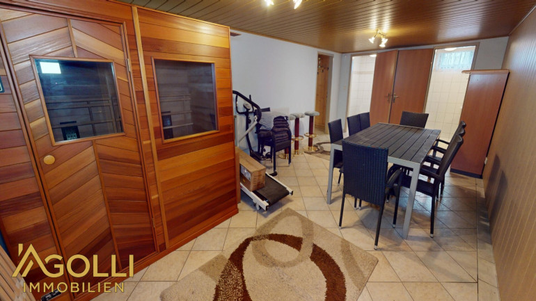 Der Bestandskeller bietet neben Technikraum und Abstellflächen auch einen gemütlichen Vorraum. Ein besonderes Highlight ist die urige Holzstube mit Sitzgarnitur und kleiner Holzbar – perfekt für gesellige Abende. Zusätzlich stehen ein separates WC sowie ein vollwertiges Badezimmer mit Eckdusche zur Verfügung. Ein weiterer großer Raum wird derzeit als Fitness- und Partyraum genutzt und bietet Platz für die vorhandene Sauna. Auch vom Keller aus gelangt man direkt in den Garten – äußerst praktisch und ideal für jede Jahreszeit.