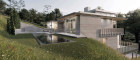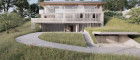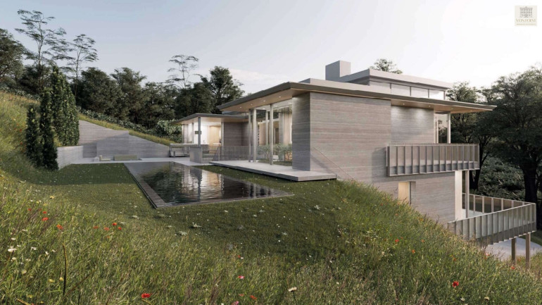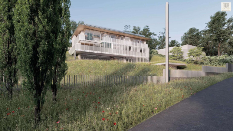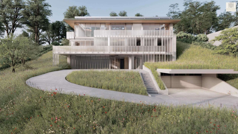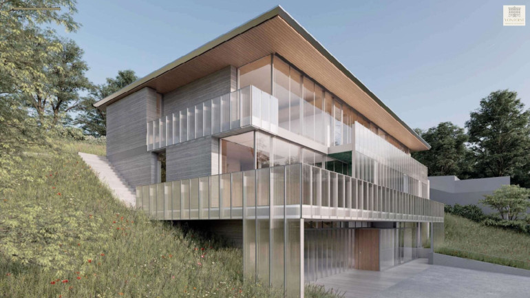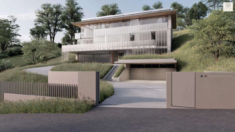 Das Gebäude wurde harmonisch in die Landschaft integriert und erstreckt sich über drei Ebenen, die funktional wie gestalterisch perfekt aufeinander abgestimmt sind. Großzügige Glasflächen, klare Linien und eine reduzierte Formensprache definieren das Erscheinungsbild und schaffen fließende Übergänge zwischen Innen- und Außenraum.