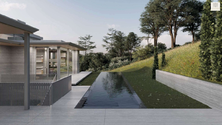 Der großzügig gestaltete Wohnbereich bildet das architektonische Herzstück des Anwesens und öffnet sich zu weitläufigen Terrassenflächen, Garten und Pool – ein Ensemble, das Ruhe, Weite und Exklusivität ausstrahlt. Die Gestaltung folgt ebenfalls einem klaren, modernen Designansatz, der Funktionalität, Ästhetik und Wohnqualität auf höchstem Niveau vereint.