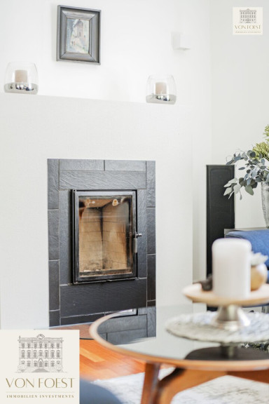 Die Villa selbst ist ein Traum im Landhausstil, der sich durch eine warme, einladende Atmosphäre und hochwertige Materialien auszeichnet. Jedes Detail ist durchdacht und trägt zur besonderen Wohnqualität bei. Betreten Sie das geräumige Wohnzimmer, das durch große Fensterfronten eine lichtdurchflutete Atmosphäre bietet. Der Blick auf den zauberhaften Garten wirkt wie ein lebendiges Gemälde. Ein Kamin sorgt an kühleren Abenden für wohlige Wärme und gemütliche Stunden.
