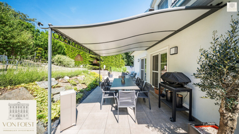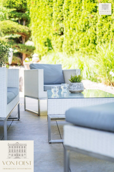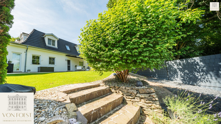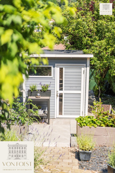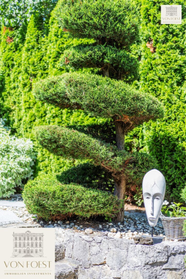 Der 960 m² große Garten ist ein wahres Paradies und ein Meisterwerk der Gartengestaltung. Auf verschiedenen Ebenen angelegt, eröffnet sich hier eine Welt der Ruhe und Schönheit. Liebevoll gepflegte Ziersträucher und kunstvoll angelegte Details machen jeden Spaziergang zu einem Erlebnis. Stellen Sie sich vor, wie Sie morgens mit einer Tasse Kaffee auf einer der Terrassen sitzen und die ersten Sonnenstrahlen genießen, während Sie die frische Luft einatmen und die Vögel zwitschern hören.