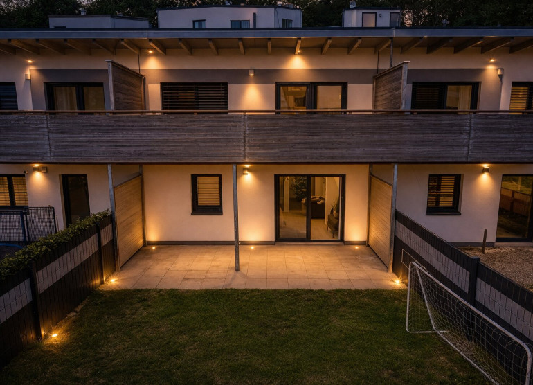 Vom Wohnbereich im Erdgeschoss gelangen Sie direkt auf die überdachte Terrasse, die auch bei ungünstiger Witterung komfortabel genutzt werden kann, sowie in den großzügigen Garten, der vielfältige Nutzungsmöglichkeiten bietet und zum Entspannen im Freien einlädt. Zwei der Zimmer im Obergeschoss verfügen über direkten Zugang zu einem großzügigen Balkon und schaffen somit zusätzlichen Freiraum sowie eine angenehme Wohnatmosphäre. Das gegenständliche Reihenhaus ist mit elektrisch gesteuerten Rollläden ausgestattet; zudem sind sämtliche Fenster mit Insektenschutzgittern versehen.