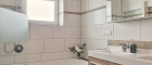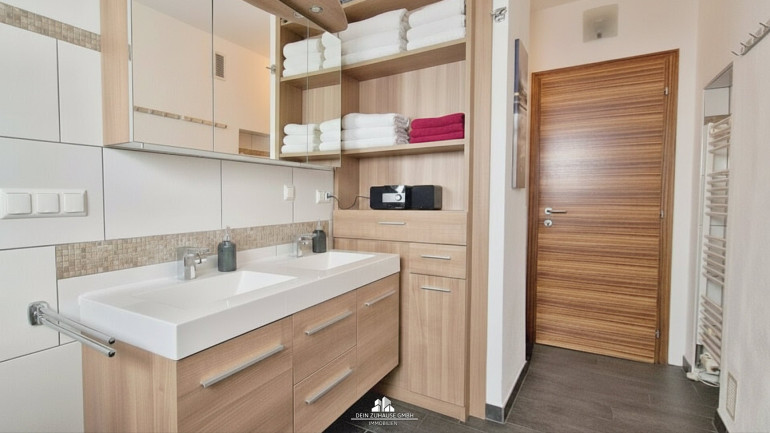 Im Badezimmer gibt es einen Doppelwaschtisch, eine Badewanne, einen Handtuchtrockner und auch die Waschmaschine findet bequem in einer Nische Platz.