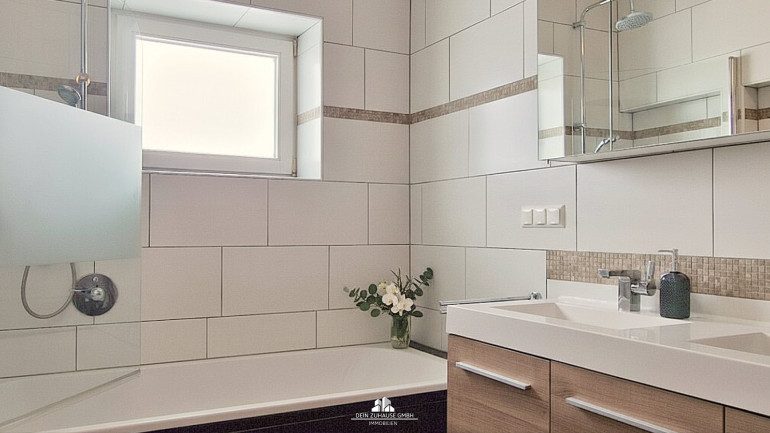 - Badezimmer mit Doppelwaschtisch, Badewanne und Fenster