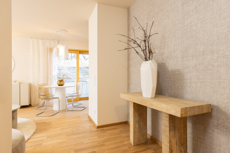 - Hochwertige Oberflächen wie Eichenparkett und 60×60 cm Feinsteinzeugfliesen