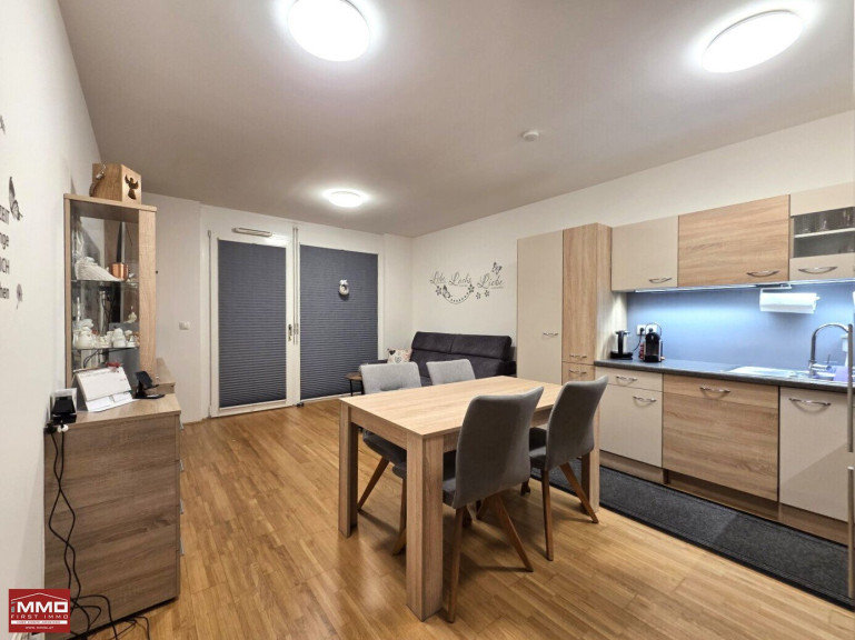Der offene Wohnbereich umfasst Küche, Ess- und Wohnzimmer und bietet direkten Zugang zur Loggia, die zum Entspannen einlädt.