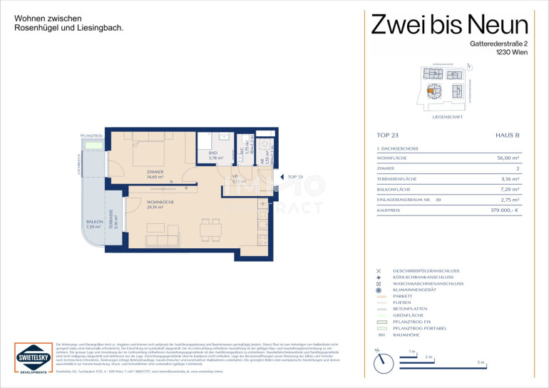Die Lage des Projekts bietet das Beste aus beiden Welten: Die lebendige Stadt ist nur einen Katzensprung entfernt, während die umliegenden Grünflächen und der Liesingbach zum Durchatmen und Entspannen einladen. Zahlreiche Nahversorger wie Supermärkte, Drogerien und Apotheken befinden sich nur wenige Schritte entfernt, und auch ein Kindergarten liegt in unmittelbarer Nähe. Für kulinarische Genüsse sorgen namhafte Weingüter, Heurige und Gasthäuser während das Einkaufszentrum Riverside eine Vielzahl an Einkaufs- und Freizeitmöglichkeiten bietet. Sport- und Naturbegeisterte finden im Liesingbachgebiet und im neu geschaffenen Stadtpark Atzgersdorf ideale Orte für Spaziergänge, Laufrunden und Erholung. Selbst das beliebte Liesinger Bad ist mit dem Fahrrad in weniger als zehn Minuten erreichbar. Der nahegelegene Autobus bringt Sie in nur 13 Minuten nach Hietzing, und der Schnellbahn-Bahnhof Atzgersdorf ist lediglich eine kurze Spazierstrecke oder eine zweiminütige Busfahrt entfernt. Von dort aus erreichen Sie die zentralen Verkehrsknotenpunkte Wien Meidling und Wien Hauptbahnhof in nur sechs bzw. zwölf Minuten. Diese gute Anbindung macht das Projekt zur idealen Basis für ein urbanes Leben im Grünen – auch ohne eigenem Auto!
