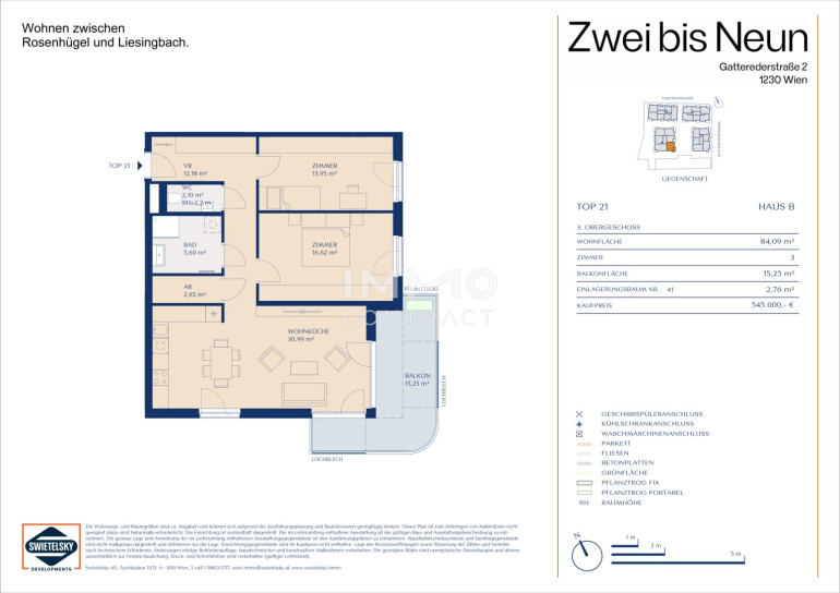 Die Lage des Projekts bietet das Beste aus beiden Welten: Die lebendige Stadt ist nur einen Katzensprung entfernt, während die umliegenden Grünflächen und der Liesingbach zum Durchatmen und Entspannen einladen. Zahlreiche Nahversorger wie Supermärkte, Drogerien und Apotheken befinden sich nur wenige Schritte entfernt, und auch ein Kindergarten liegt in unmittelbarer Nähe. Für kulinarische Genüsse sorgen namhafte Weingüter, Heurige und Gasthäuser während das Einkaufszentrum Riverside eine Vielzahl an Einkaufs- und Freizeitmöglichkeiten bietet. Sport- und Naturbegeisterte finden im Liesingbachgebiet und im neu geschaffenen Stadtpark Atzgersdorf ideale Orte für Spaziergänge, Laufrunden und Erholung. Selbst das beliebte Liesinger Bad ist mit dem Fahrrad in weniger als zehn Minuten erreichbar. Der nahegelegene Autobus bringt Sie in nur 13 Minuten nach Hietzing, und der Schnellbahn-Bahnhof Atzgersdorf ist lediglich eine kurze Spazierstrecke oder eine zweiminütige Busfahrt entfernt. Von dort aus erreichen Sie die zentralen Verkehrsknotenpunkte Wien Meidling und Wien Hauptbahnhof in nur sechs bzw. zwölf Minuten. Diese gute Anbindung macht das Projekt zur idealen Basis für ein urbanes Leben im Grünen – auch ohne eigenem Auto!