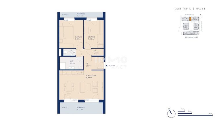 Die Wohnküche mit der größeren Terrasse ist südseitige ausgerichtet. Genussvolle Sonnenstunden sind somit garantiert.