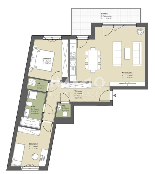 Diese exklusive Dreizimmer-Wohnung mit einladendem Balkon in den begrünten Innenhof wird Sie begeistern! Sie gliedert sich in eine lichtdurchflutete Wohnküche und ein Elternschlafzimmer, von denen aus der Balkon begehbar ist. Ein Kinder- bzw. Arbeitszimmer, ein Badezimmer mit Dusche, Badewanne, Toilette sowie ein Abstellraum und separates Gäste-WC komplettieren diesen besonderen Grundriss.
