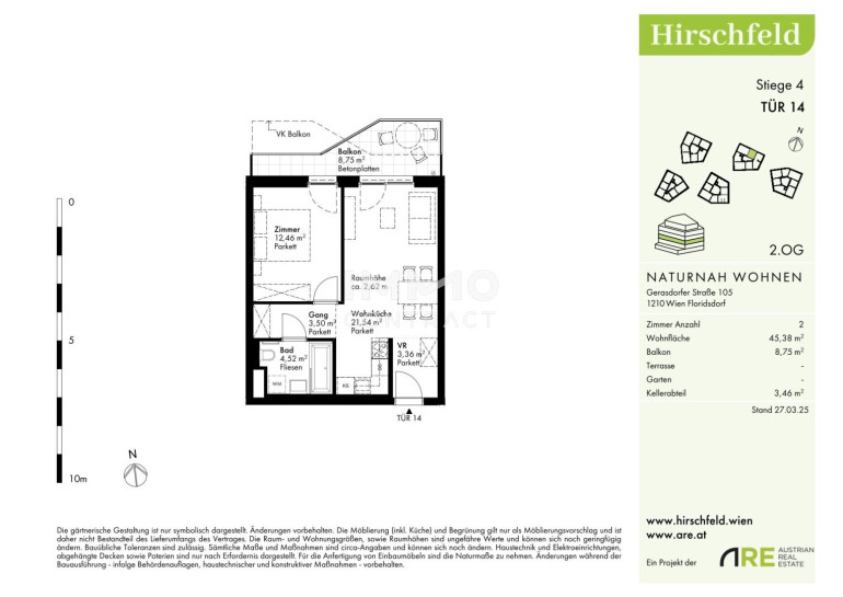 Naturnah und gut angebunden Hirschfeld ist ein beschauliches Viertel am Wiener Stadtrand. Die Metropole im Rücken verheißt jedem Nachhausekommen ein Naturerlebnis und Entspannung. Wer gerne mit den Wiener Linien unterwegs ist, nimmt am besten die Autobuslinie 32A ab Kollarzgasse bis zum U- und S-Bahn-Knotenpunkt Leopoldau. Von hier aus ermöglichen die U1 in Richtung Zentrum sowie die Schnellbahnlinien S1, S2 und S7 eine rasche Verbindung stadtein- und stadtauswärts. Alternativ verläuft die Straßenbahnlinie 31 entlang der Brünner Straße über Floridsdorf direkt bis Schottenring. Autofahrer profitieren von der nahegelegenen A22.