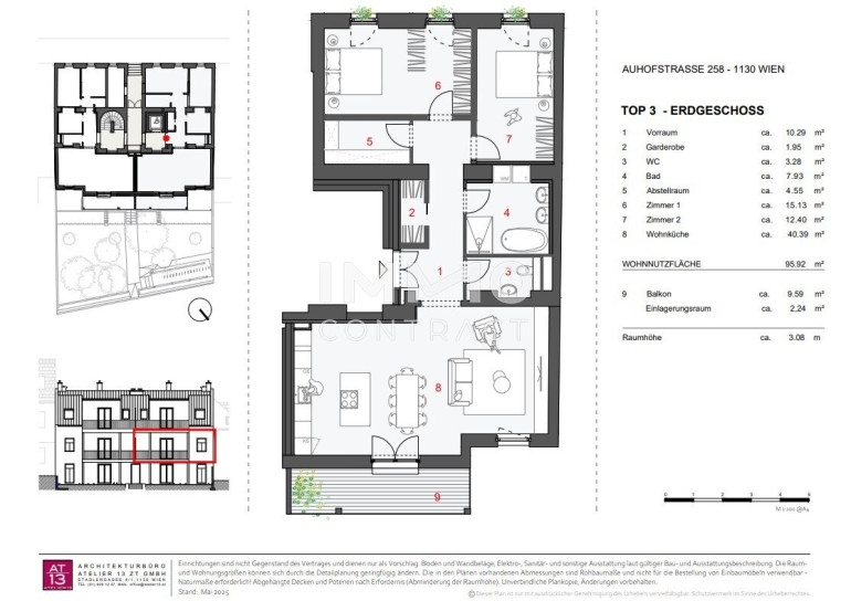 Der weitläufige Wohn- und Essbereich mit 40,39 m² ist lichtdurchflutet und öffnet sich zum 9,59 m² großen Balkon – ideal für entspannte Stunden im Freien. Zwei Schlafzimmer, ein modernes Badezimmer, separates WC, praktischer Abstellraum sowie Garderobe im Eingangsbereich sorgen für hohen Wohnkomfort.