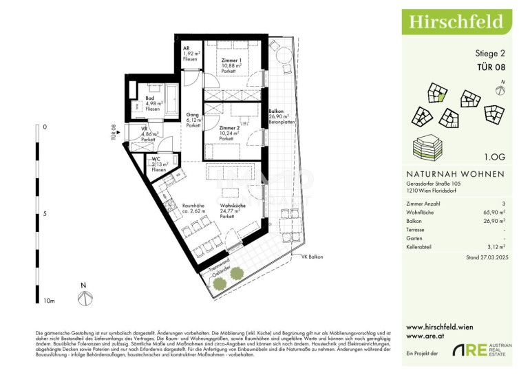 Naturnah und gut angebunden Hirschfeld ist ein beschauliches Viertel am Wiener Stadtrand. Die Metropole im Rücken verheißt jedem Nachhausekommen ein Naturerlebnis und Entspannung. Wer gerne mit den Wiener Linien unterwegs ist, nimmt am besten die Autobuslinie 32A ab Kollarzgasse bis zum U- und S-Bahn-Knotenpunkt Leopoldau. Von hier aus ermöglichen die U1 in Richtung Zentrum sowie die Schnellbahnlinien S1, S2 und S7 eine rasche Verbindung stadtein- und stadtauswärts. Alternativ verläuft die Straßenbahnlinie 31 entlang der Brünner Straße über Floridsdorf direkt bis Schottenring. Autofahrer profitieren von der nahegelegenen A22.