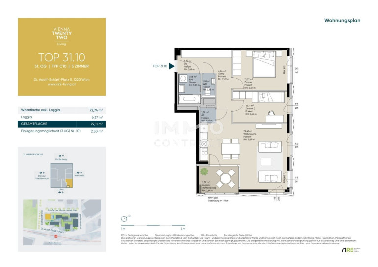 VIENNA TWENTYTWO Living ist ein modernes und zukunftsorientiertes Wohnprojekt im 22. Wiener Gemeindebezirk, Donaustadt, welches sich als Teil eines Hochhausensembles durch eine ausgezeichnete Lage, moderne Architektur und durchdachte Ausstattung auszeichnet. Die Wohnungen bieten den perfekten Rückzugsort für anspruchsvolle Bewohner, die sowohl die Nähe zur Stadt als auch Ruhe und Natur schätzen.Im Wohnturm befinden sich rund 300 Wohnungen in unterschiedlichen Größen, aufgeteilt in vier Ausstattungskategorien. Die wenigen noch verfügbaren Einheiten verfügen über 2-4 Zimmer und sind zwischen ca. 46 m² - ca. 215 m² groß. Sämtliche der verfügbaren Eigentumswohnungen befinden sich im 22. – 32. Stockwerk und überzeugen mit der hochwertigen Ausstattungslinie „Sky Living“ (22. - 30. OG), wobei sich die Penthouse-Etagen (31. - 32. OG) nochmals in Ihrer Beschaffenheit abheben.