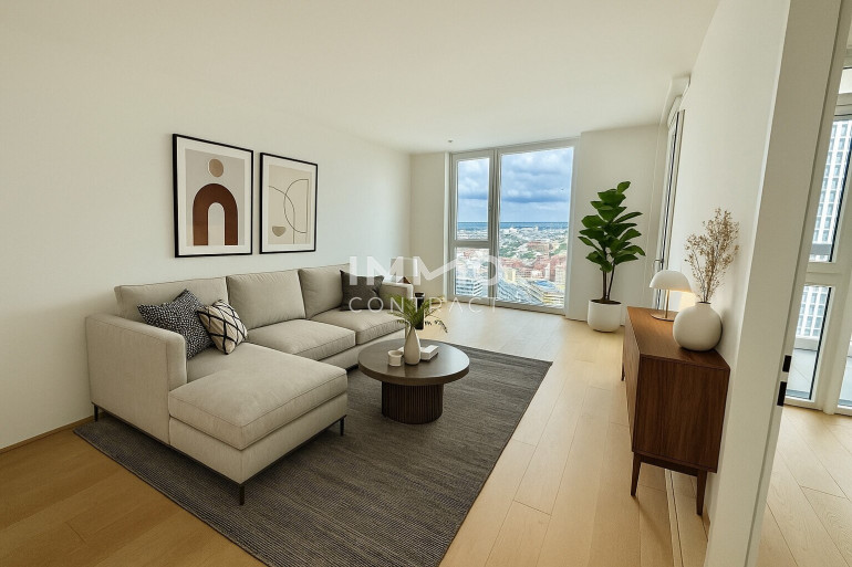 Im Wohnturm befinden sich rund 300 Wohnungen in unterschiedlichen Größen, aufgeteilt in vier Ausstattungskategorien. Die wenigen noch verfügbaren Einheiten verfügen über 2-4 Zimmer und sind zwischen ca. 46 m² - ca. 215 m² groß. Sämtliche der verfügbaren Eigentumswohnungen befinden sich im 22. – 32. Stockwerk und überzeugen mit der hochwertigen Ausstattungslinie „Sky Living“ (22. - 30. OG), wobei sich die Penthouse-Etagen (31. - 32. OG) nochmals in Ihrer Beschaffenheit abheben.