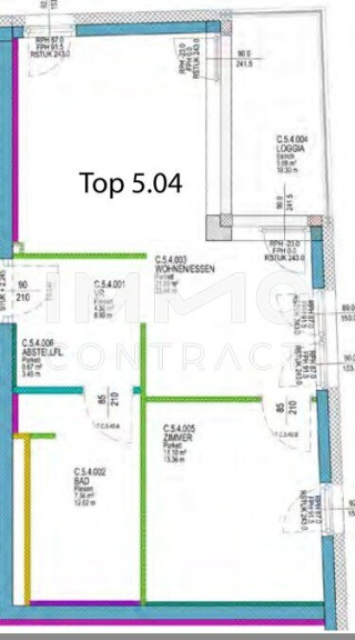 Raumaufteilung Top 5.04: Vorraum, Wohn-Essbereich, Loggia, Schlafzimmer, Bad/WC + Kellerabteil.