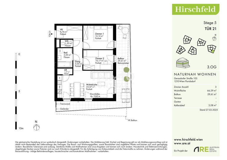 Naturnah und gut angebunden Hirschfeld ist ein beschauliches Viertel am Wiener Stadtrand. Die Metropole im Rücken verheißt jedem Nachhausekommen ein Naturerlebnis und Entspannung. Wer gerne mit den Wiener Linien unterwegs ist, nimmt am besten die Autobuslinie 32A ab Kollarzgasse bis zum U- und S-Bahn-Knotenpunkt Leopoldau. Von hier aus ermöglichen die U1 in Richtung Zentrum sowie die Schnellbahnlinien S1, S2 und S7 eine rasche Verbindung stadtein- und stadtauswärts. Alternativ verläuft die Straßenbahnlinie 31 entlang der Brünner Straße über Floridsdorf direkt bis Schottenring. Autofahrer profitieren von der nahegelegenen A22.