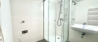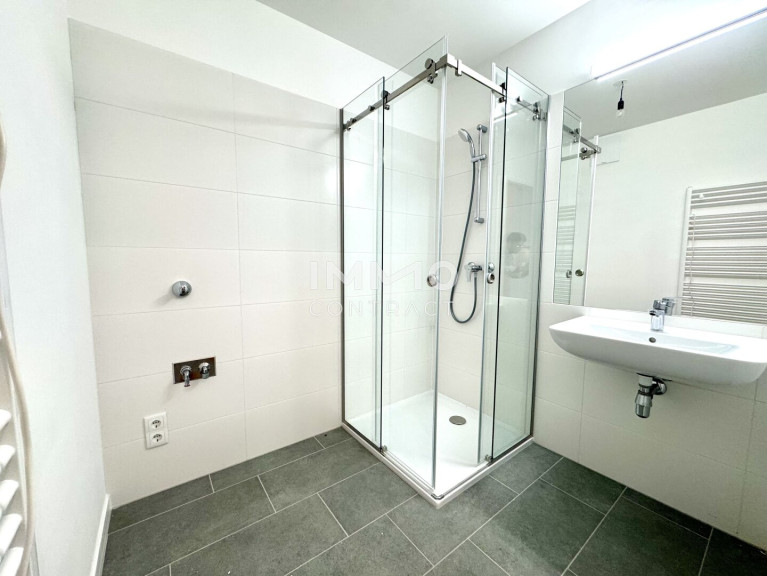 Das Badezimmer ist mit einer bodenebenen Dusche ausgestattet und modern verfliest.