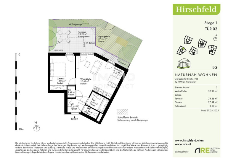 Naturnah und gut angebunden Hirschfeld ist ein beschauliches Viertel am Wiener Stadtrand. Die Metropole im Rücken verheißt jedem Nachhausekommen ein Naturerlebnis und Entspannung. Wer gerne mit den Wiener Linien unterwegs ist, nimmt am besten die Autobuslinie 32A ab Kollarzgasse bis zum U- und S-Bahn-Knotenpunkt Leopoldau. Von hier aus ermöglichen die U1 in Richtung Zentrum sowie die Schnellbahnlinien S1, S2 und S7 eine rasche Verbindung stadtein- und stadtauswärts. Alternativ verläuft die Straßenbahnlinie 31 entlang der Brünner Straße über Floridsdorf direkt bis Schottenring. Autofahrer profitieren von der nahegelegenen A22.