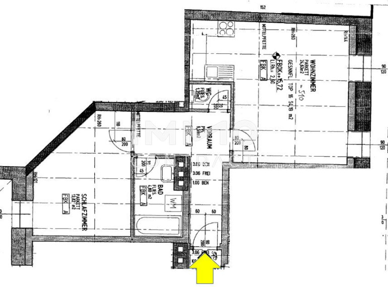 Raumaufteilung: Vorraum, Bad, WC, Wohn-Esszimmer mit Küche, Schlafzimmer