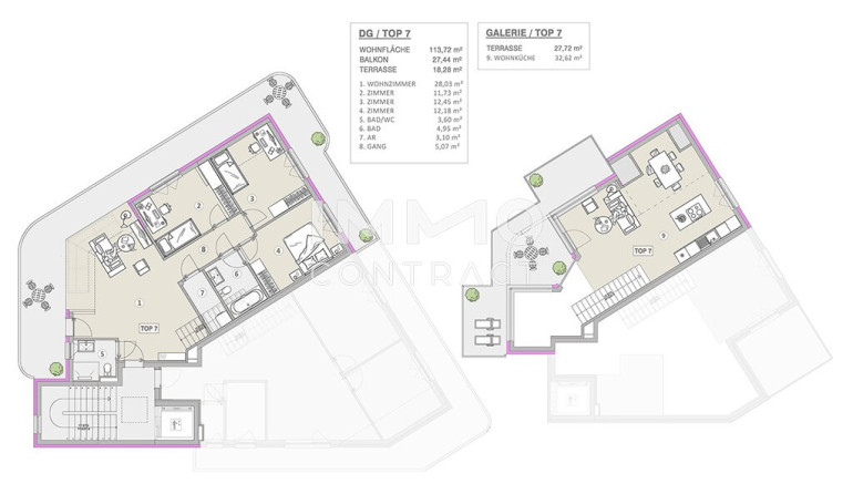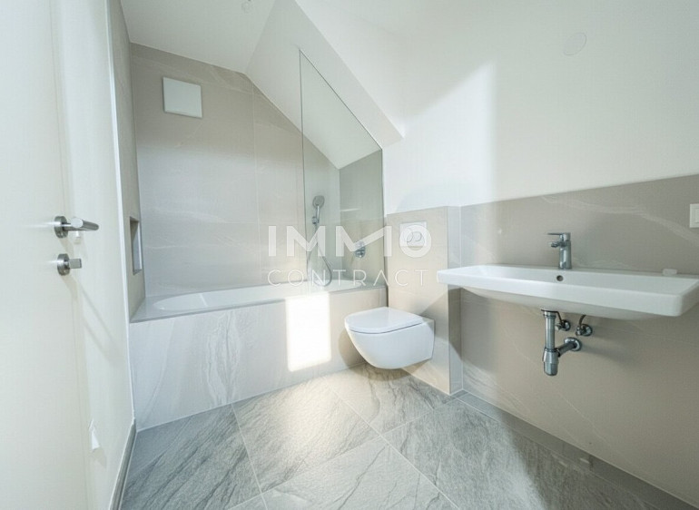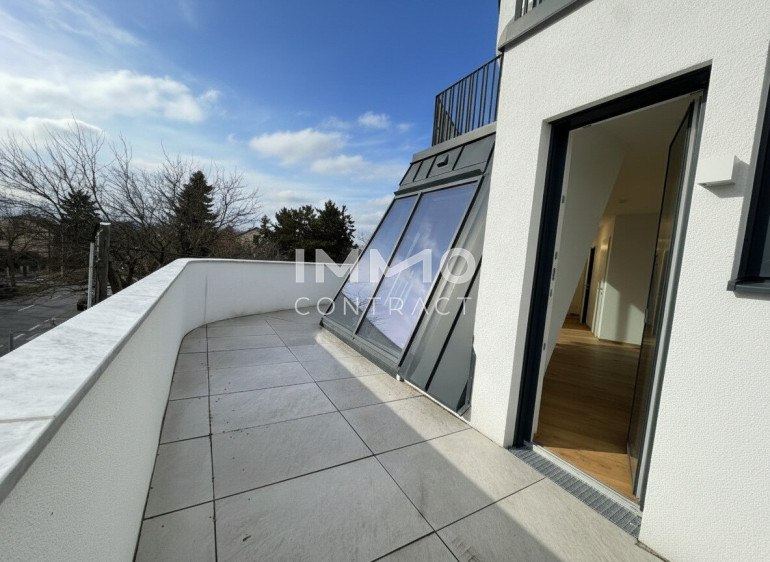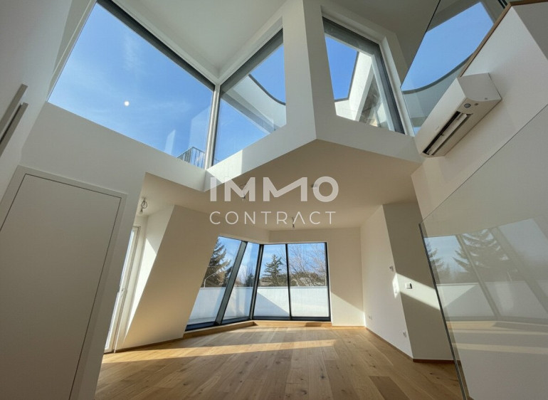 Top 7 begeistert mit lichtdurchfluteten Räumen und großzügigen Glasflächen. Das offene Konzept mit bis zu knapp 6 m Raumhöhe und weitläufigen Außenbereichen sorgt für ein höchst beeindruckendes Wohngefühl. Das außergewöhnliche Penthouse bietet auf rund 114 m² Wohnfläche verteilt auf zwei Ebenen viel Platz für exklusive Wohnträume – perfekt für alle, die etwas ganz Besonderes suchen. Die drei Schlafräume eröffnen vielfältige Nutzungsmöglichkeiten: Arbeiten im eigenen Homeoffice, ein separates Fitness- oder Yogazimmer oder ein komfortabler Gästebereich. Zwei Badezimmer – eines mit Badewanne und WC, das andere mit Dusche, WC und Fenster mit Grünblick – sorgen für zusätzlichen Komfort. Die beiden weitläufigen Terrassen ergänzen das Wohnerlebnis: Die untere Terrasse mit ca. 45 m² Außenfläche eignet sich ideal als ruhiger Sonnenplatz mit charmanter Bepflanzung, während die obere Terrasse mit ca. 28 m² perfekt für entspannte Abende mit Freunden als Outdoor-Wohnzimmer oder privater Sonnenbereich genutzt werden kann.