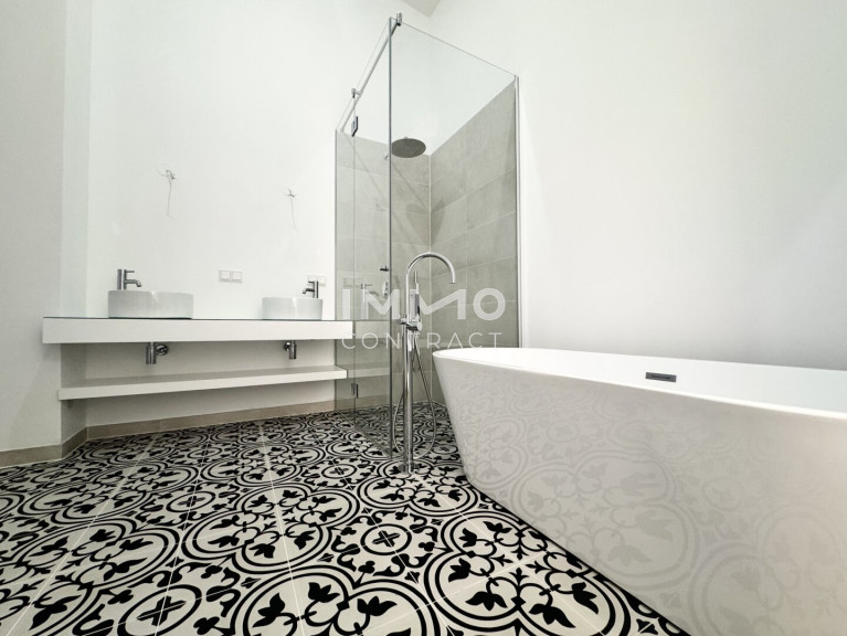 Das hochwertig ausgestattete Badezimmer verfügt über eine bodenebene Dusche mit Glasabtrennung, ausgewählte Armaturen, Waschmaschinenanschluss sowie einen elektrischen Handtuchheizkörper. Ein separates WC sowie ein praktischer Abstellraum ergänzen die funktionale Raumaufteilung.