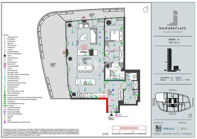 Zum Verkauf gelangt diese außergewöhnliches Apartment, dessen Wohn-Essbereich mit einer Fläche von über 61 Quadratmeter das Herzstück des Apartments darstellt. Die großflächigen Verglasungen und die süd-westseitige Ausrichtung garantieren viele Sonnenstunden und der über 42 Quadratmeter große Balkon Richtung Wiener City lädt zum Verweilen ein. Auch vom geräumigen Schlafzimmer ist der Austritt auf den Balkon möglich, das En-Suite Bad verfügt neben einer Toilette und Handwaschbecken auch über eine Dusche und eine Badeanne. Ein geräumiger Abstellraum, in dem sich der Waschmaschinenanschluss befindet, schafft Stauraum innerhalb des Wohnungsverbands und erweitert die Garderobenfläche. Eine Gäste-Toilette - zentral vom Vorraum aus begehbar - schafft weiteren Komfort.