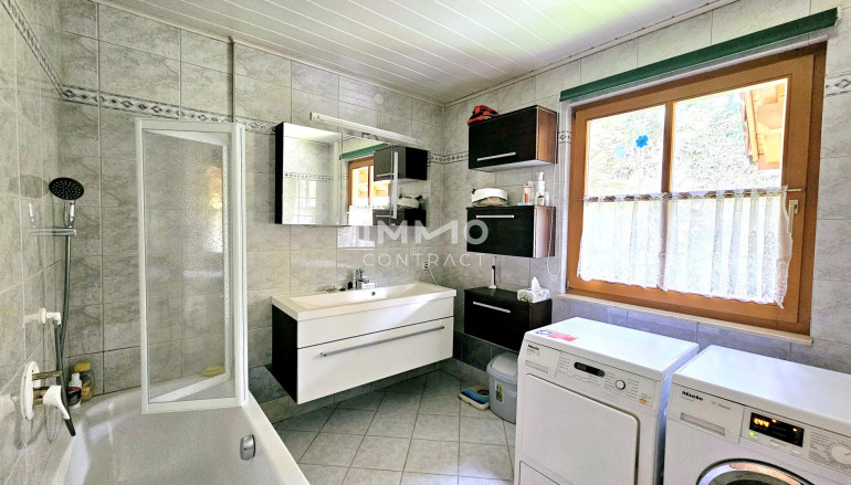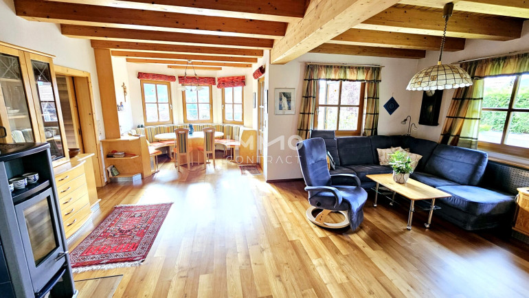 Das Erdgeschoß besteht aus einem großzügigen Wohn-/Esszimmer mit Specksteinofen, moderner Küche, Gästezimmer, Bad mit Badewanne, Gäste WC und Vorzimmer.